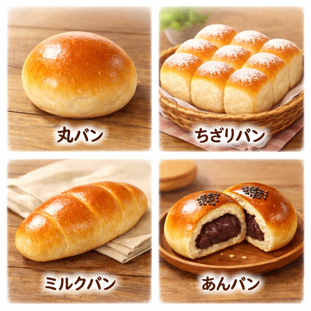 この配合が向いているのは、丸パン、ちぎりパン、ミルクパン、あんぱんなど、